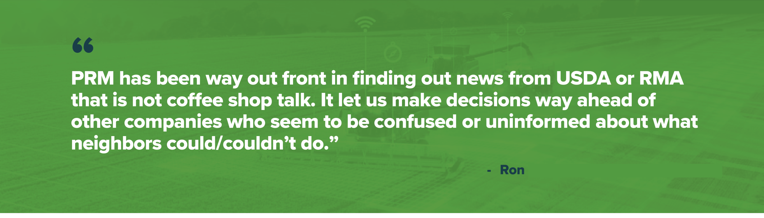 Precision Risk Management puts the grower first with our team approach. Our team gives growers more services. We have crafted the best risk management strategies utilizing the full federal crop insurance options, farm programs, and private products. PRM applies grower data from precision technology to give growers a competitive advantage. PRM is the partner you need to make your operations successful. Crop Insurance Done Better.