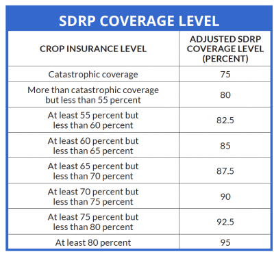 The SDRP Payment Factor is based on your coverage level. For example, if you had 75% coverage level: Crop Insurance Guarantee x .925. The table below shows the SDRP Factors based on coverage level.