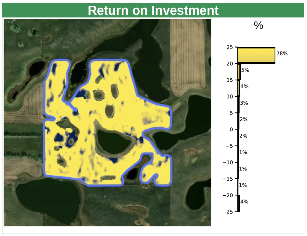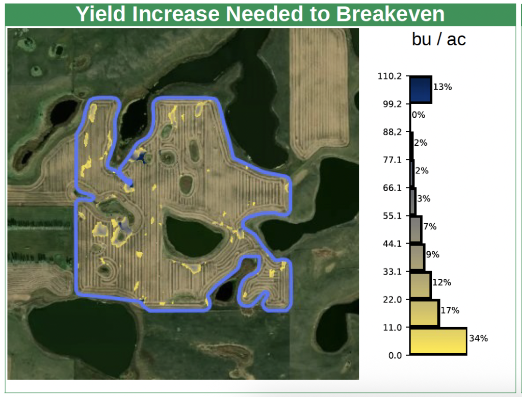 We can see a huge swing in profitability. With precision acres, we dig deep into each part of the field of where we are now losing profit. The two maps below show where there is a negative return and how much yield would need to increase to breakeven. Many of these areas are around the unplanted, low, and wet areas. ย With this knowledge, it may be worth considering expanding the unplanted areas for next year if prices stay low.