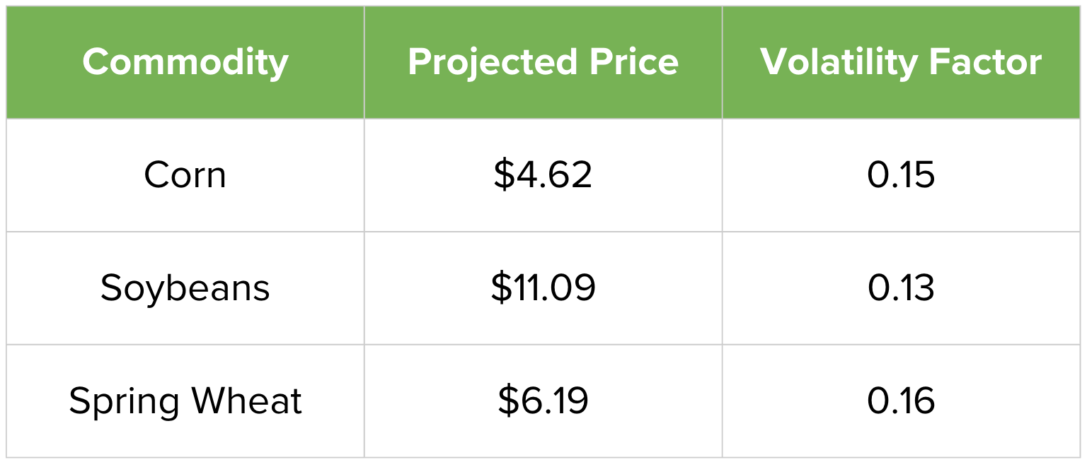 Compared to 2025, volatility factors have dropped. These volatility factors play a significant role in determining premium cost. Plus, corn and spring wheat’s projected prices have dropped. Last year’s projected prices were $4.70 for corn, $10.54 for soybeans, and $6.55 for spring wheat. The lower prices and volatility this year translate directly into lower premium costs for producers.