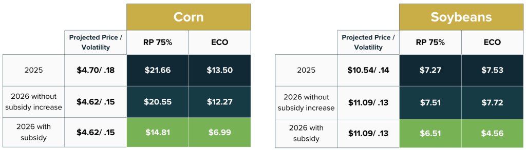 As you can see, the savings allow the producer the ability to look at additional options. For corn, the RP 75% premium drops from $21.66 per acre in 2025 to just $14.86 with the subsidy increase. That’s a 32% reduction. ECO coverage on corn falls from $13.50 to $7.10, nearly cut in half.